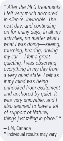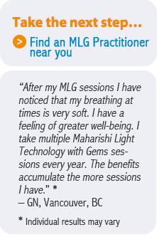 Maharishi Light Technology with Gems (MLG*) bathes specific areas of the body with soft, coherent light that has been passed through high-quality gemstones such as diamonds, emeralds, rubies, blue sapphires, and yellow sapphires. The sessions are enjoyable, deeply relaxing, and rejuvenating for mind and body.